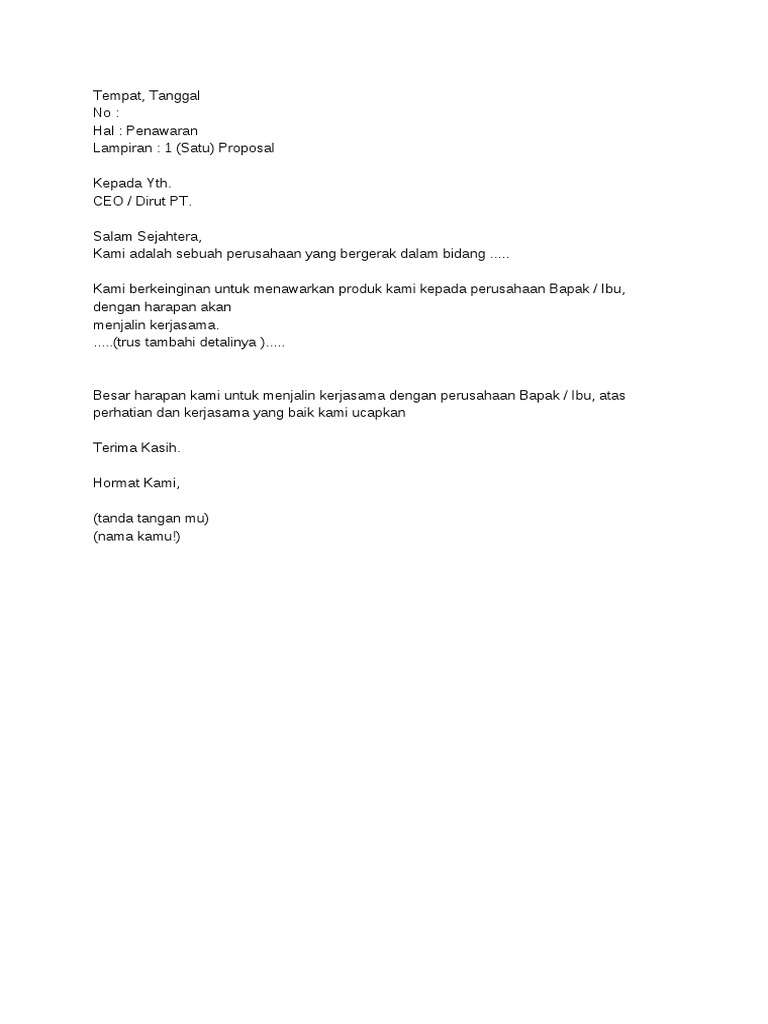 Dari beberapa contoh surat penawaran jasa di bawah ini, dapat disimpulkan bahwa surat penawaran produk barang dan jasa sebenarnya tidak jauh berbeda. Selain itu, produk yang ditawarkan bisa menjadi salah satu produk yang dibeli oleh. Contoh surat penawaran produk makanan juga bisa dilihat contoh penawaran jasa catering. Disamping memiliki pengaruh yang baik untuk membuat jenis usaha kita dapat laris dan laku dipasaran. We are a sharing community. Oleh karena itu tak ada salahnya anda mempelajari contoh surat penawaran barang sejak sekarang. Makmur kencana dengan menyertakan beberapa dokumen sebagai bahan pertimbangan. Contoh surat penawaran catering makanan. Kami mengucapkan terimakasih atas waktu dan kerjasamanya. Contoh surat penawaran produk makanan catering. Teknik perbaikan, pemasangan dan perawatan jl. Contoh surat penawaran banyak sekali, sehingga anda bisa menyesuaikan dengan bidang pekerjaan anda. Surat penawaran sendiri adalah surat yang dibuat dengan tujuan untuk menawarkan sesuatu, baik barang.